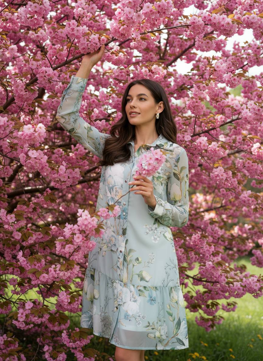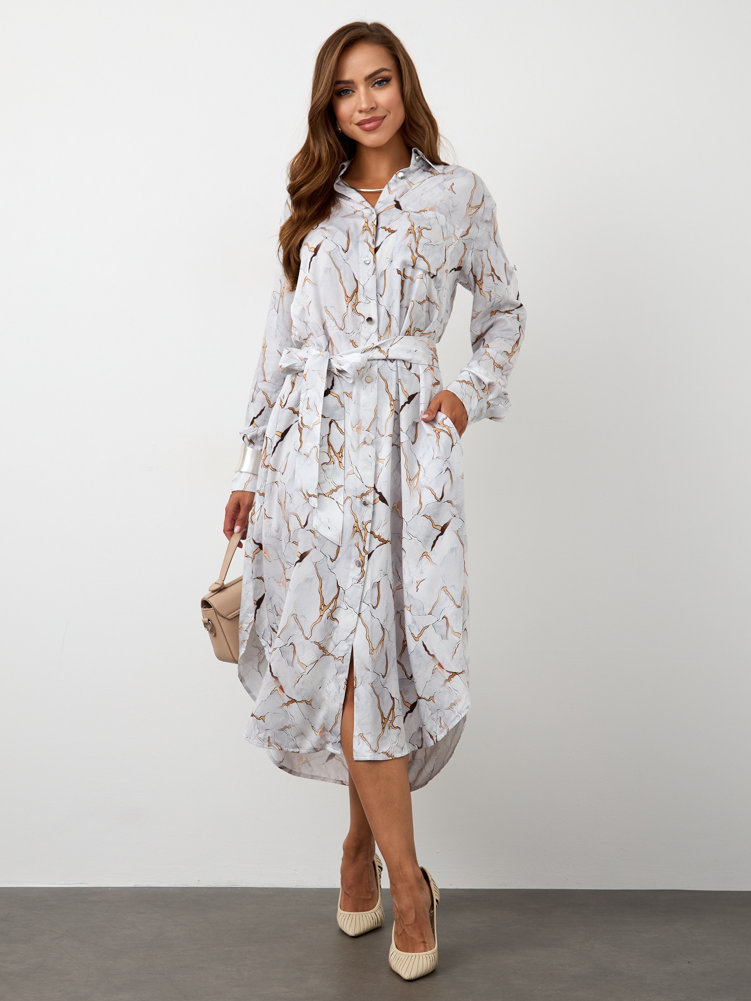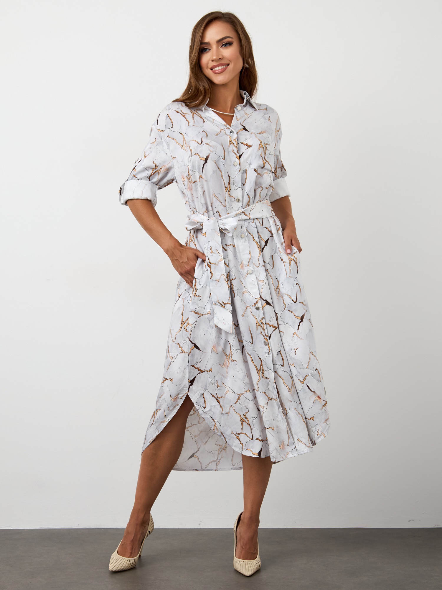 Женское весеннее платье привлекает внимание своей нежной атмосферой. Оно идеально подходит для любого события, будь то праздник или свадьба. Легкая ткань создает ощущение комфорта и воздушности, а длинная юбка миди расклешенного кроя добавляет элегантность вашему образу. Принт напоминает изысканный мраморный узор, которые придают этой одежде уникальность.