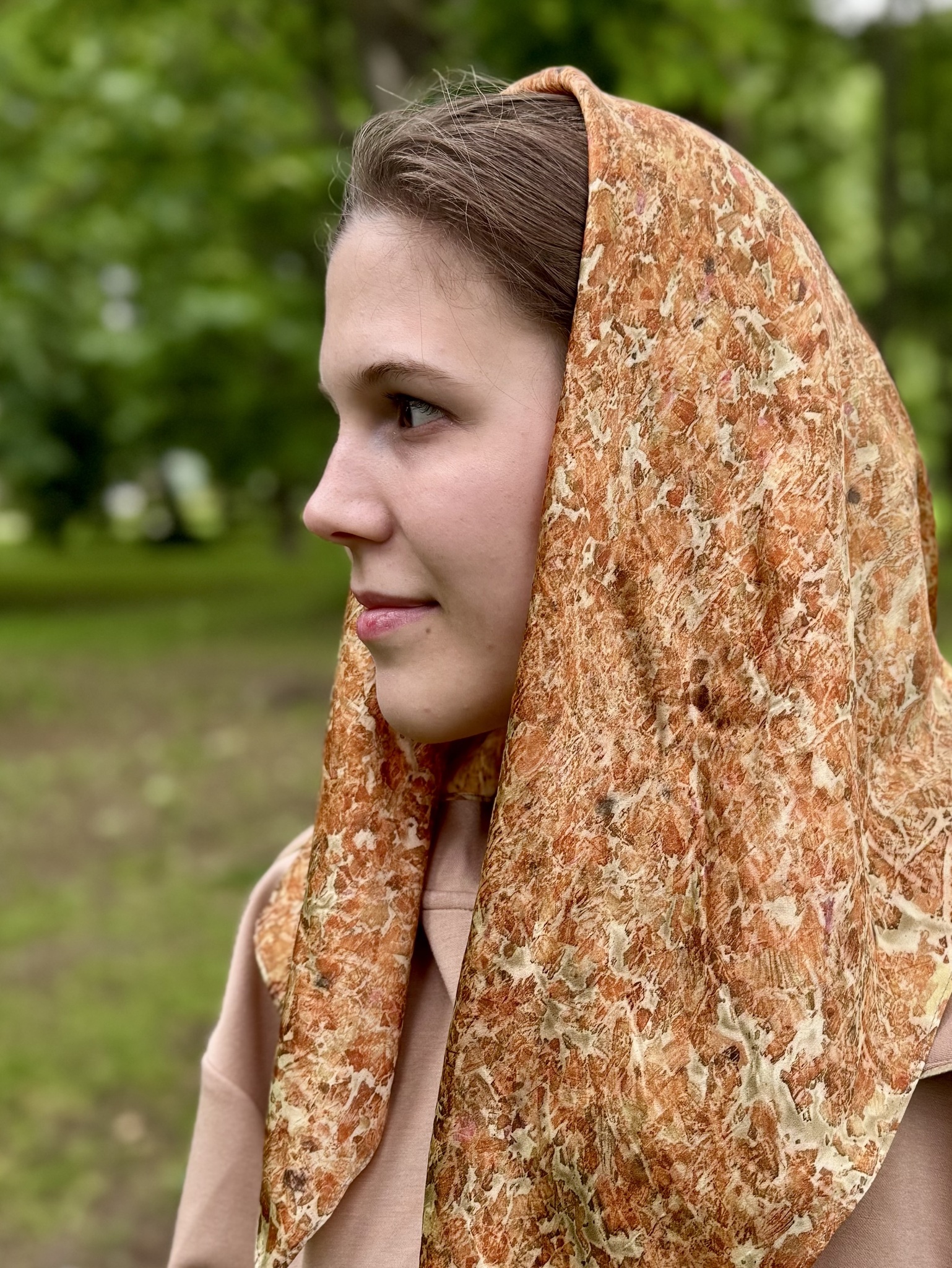 Шелковый платок «Пески Калахари» для самых изысканных натур выполнен вручную в технике контактного крашения, экопринт.
